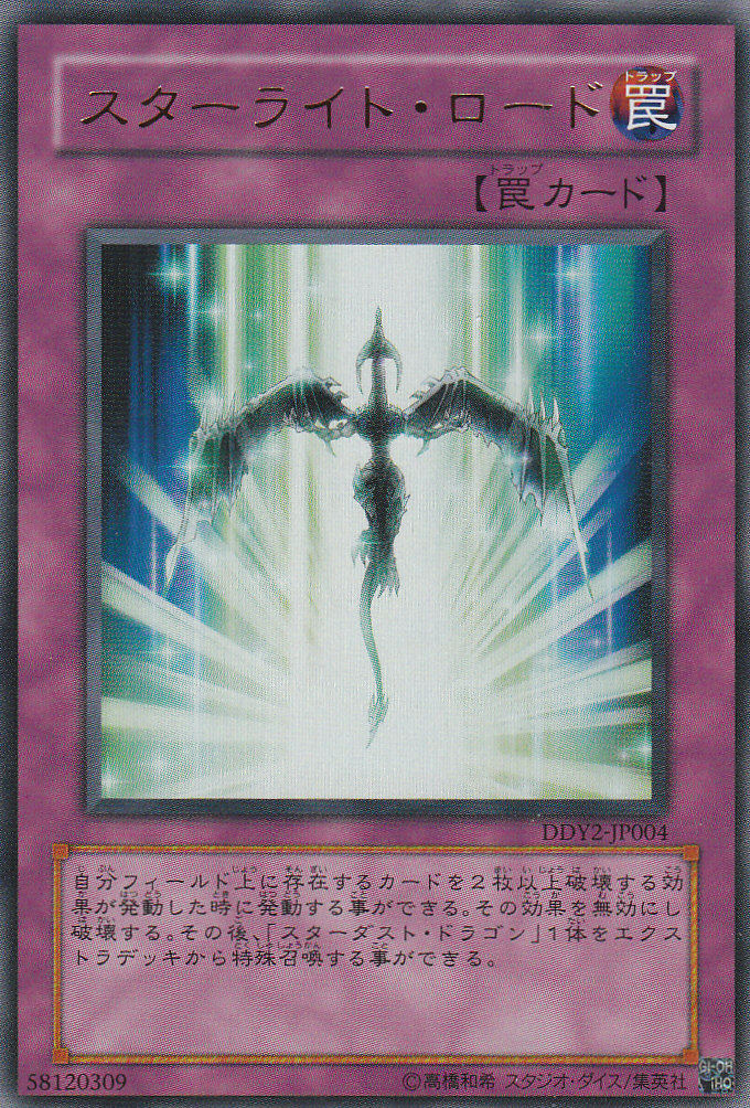 その場合、スターライトロードと何かもう一枚を伏せることで、さらにそれに大嵐を撃つことで、スターライドロードを発動してスターダストドラゴンを呼び出すことが出来るのです。